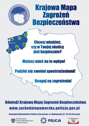 - Krajowa Mapa Zagrożeń Bezpieczeństwa dla województwa zachodniopomorskiego już działa! W województwie zachodniopomorskim ruszył program Krajowej Mapy Zagrożeń Bezpieczeństwa. Każdy mieszkaniec naszego regionu może zareagować na zagrożenia i podzielić się spostrzeżeniami. Może także sprawdzić czy w danej okolicy jest bezpiecznie i mieć na to wpływ. Odwiedź Krajową Mapę Zagrożeń Bezpieczeństwa.
